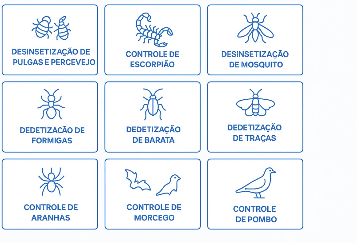 Controle de pragas: Identificação e eliminação de insetos (baratas, formigas, mosquitos, etc.) e outros animais (ratos, cupins, pombos, etc.) indesejados.
